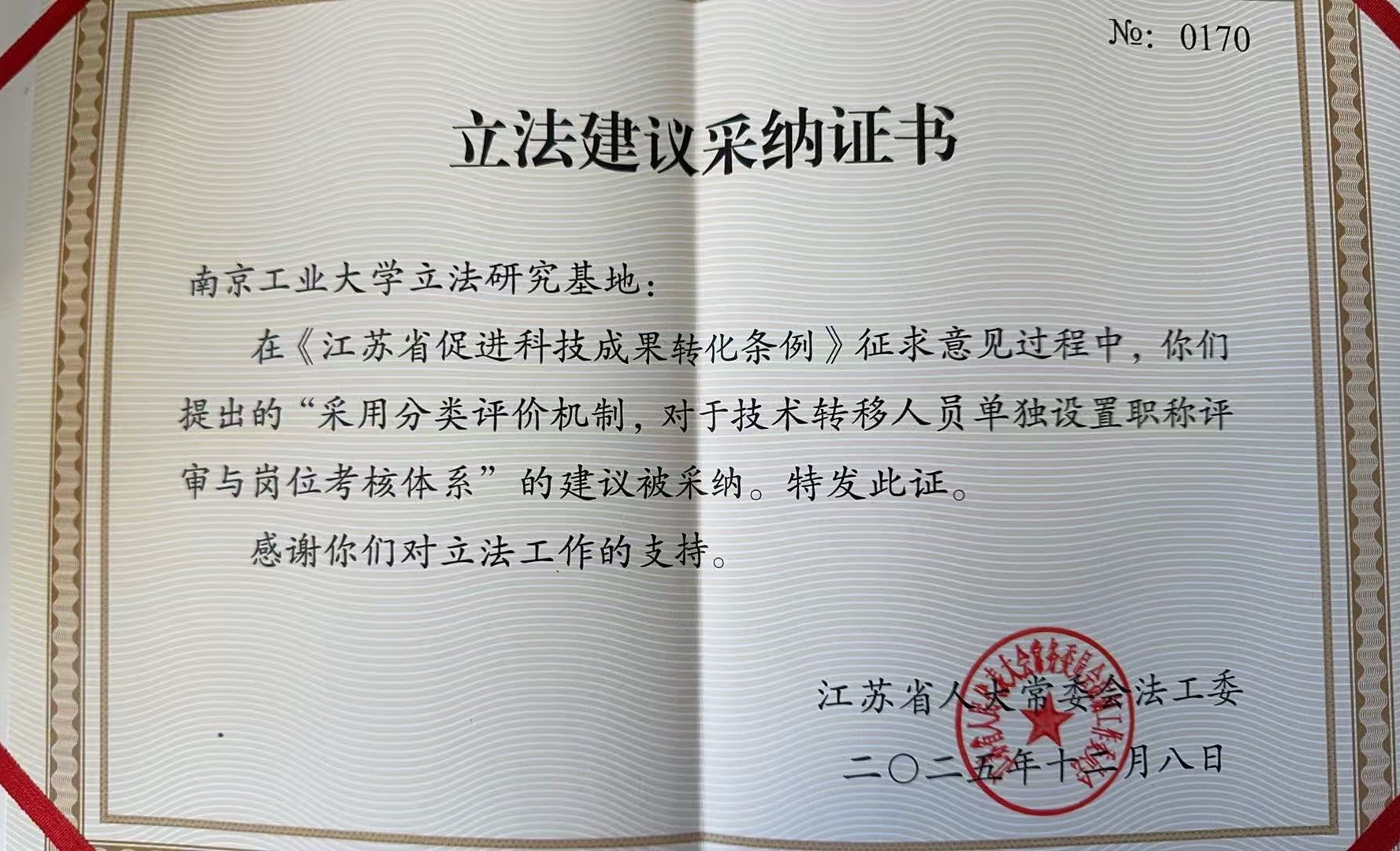 近日,我校江苏省地方立法研究基地针对《江苏省促进科技成果转化条例》修订的立法建议获省人大常委会采纳,省人大常委会法工委为基地颁发立法建议采纳证书。